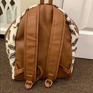 Call It Spring backpack with feather design. Faux leather straps and details. Front zipper pocket with tassel. Only used a few times.