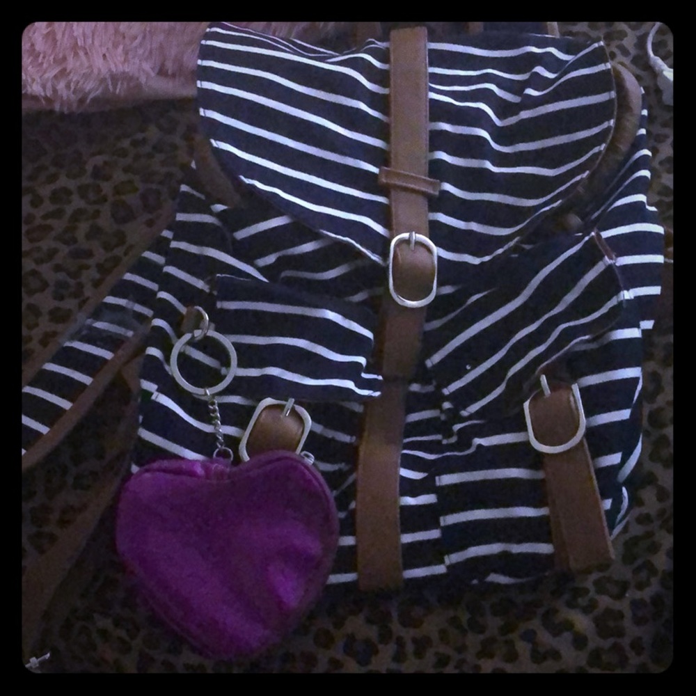 A striped backpack with a little purple glittery pouch. It hold a lot of stuff!