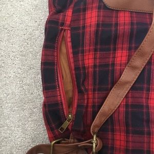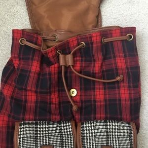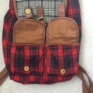 Cute plaid backpack. Pretty spacious and can be used for many things. It has a few deformities (one broken buckle as pictured and also a broken zipper on the inside) but other than that, it’s in good condition.