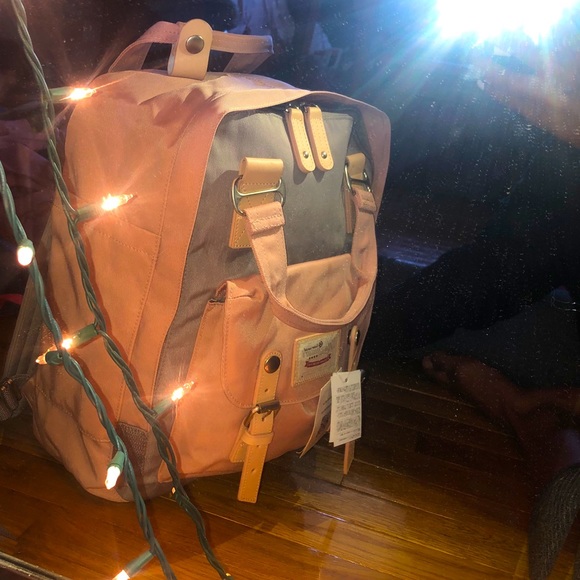 Pink and grey fashionable backpack. Laptop holder and a lot of space inside.