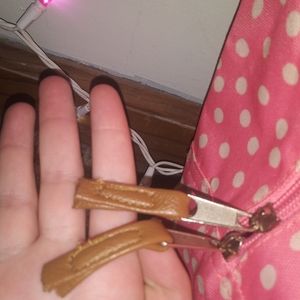 Pink and white polka dot Comes with the white puff ball 2 zipper 2 strap (adjustable)