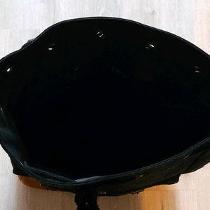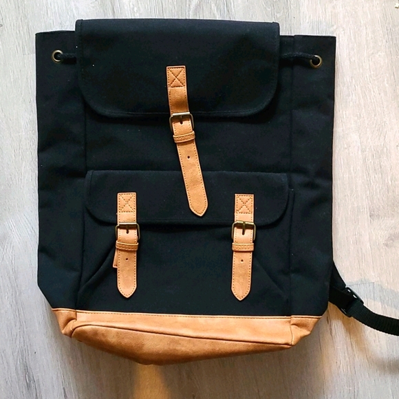 Black canvas bag with leather bottom and straps
