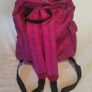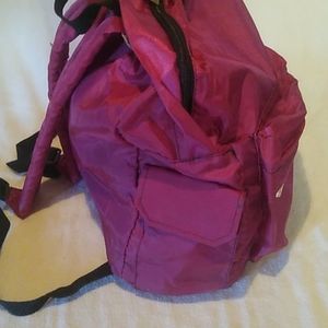 Magenta colored backpack Front zippered pocket one side pocket side pencil holders ample space inside and adjustable straps.