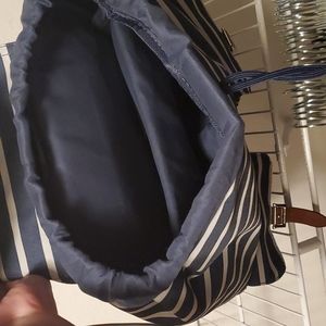 NWOT Navy and white striped backpack. It has 2 pockets on the front , perfect size for cell phone, keys, pens, makeup, etc. There are 1 compartments on the inside. The main compartment has a drawstring and the flap with a button closure. Never been used.