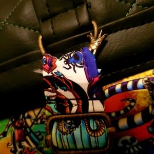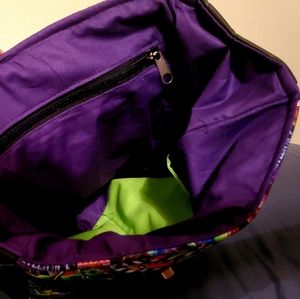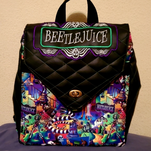 11x12x4.5 size backpack. Custom made by me. Beetlejuice inspired. Hidden front zipper pocket, inside zipper pocket and 2 inside pockets.