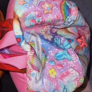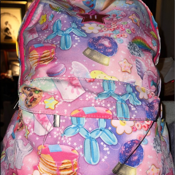 Brand new backpack with pink iridescent straps One pocket on each side for a water bottle the backpack is also fairly large and has a nice size front pocket .