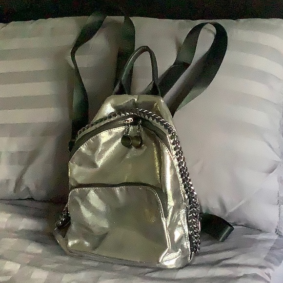 Silver with black straps & chain detailing. Big pocket in front with zipper & zipper all around top & sides & also zipper in back to separate pocket. Like new condition