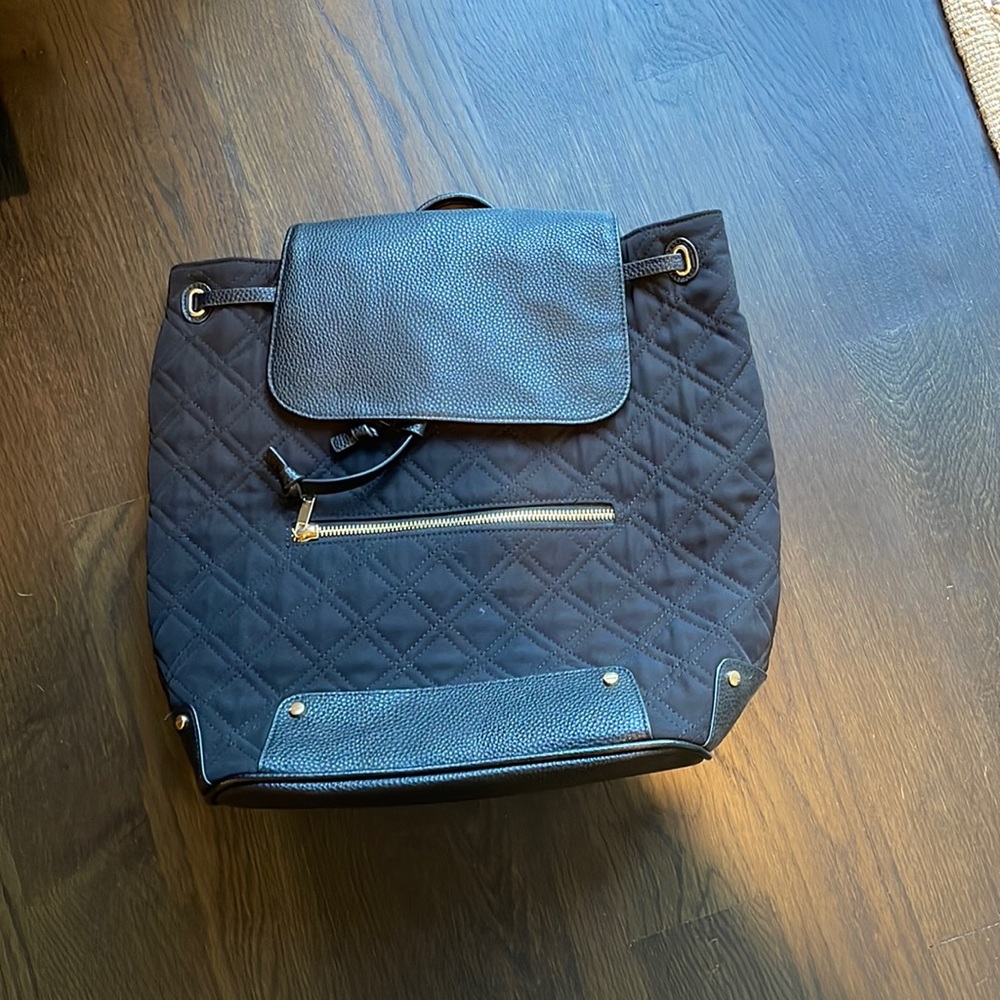 Quilted nylon and faux leather trim with gold hardware. Adjustable straps and cinch closure. Extra flap with snap