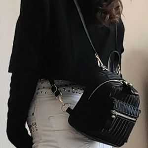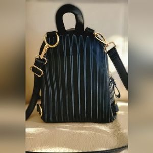 New, beautiful light with detachable straps to wear as a backpack or shoulder bag. multiple pockets , and stunning material shiny deep. it's so pretty and unique.