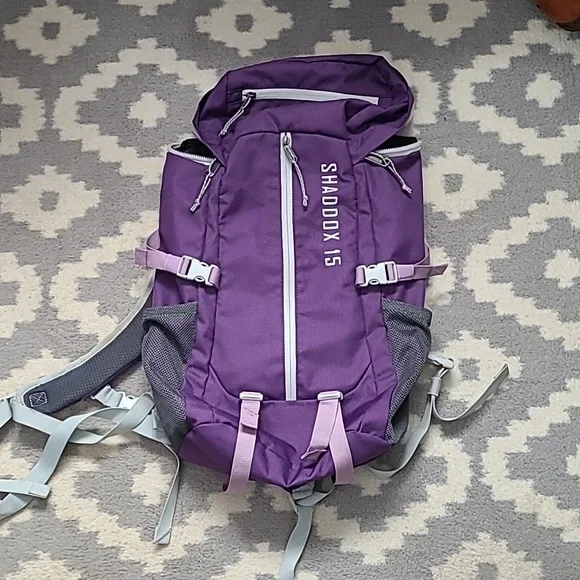 Like new. North Range backpack. Purple with light purple and gray accents. All buckles and zippers work. Side pockets. Has a spot for straw for a water/hydration pack (last pics).