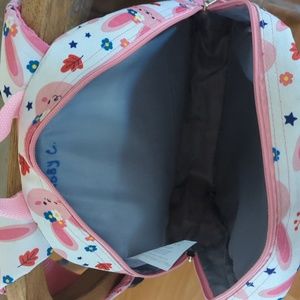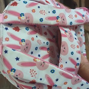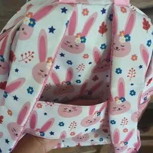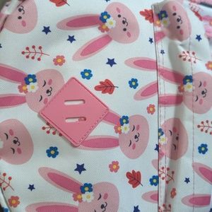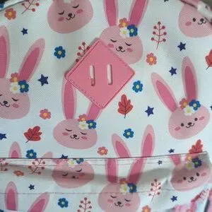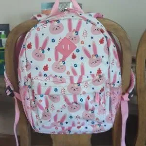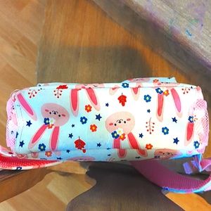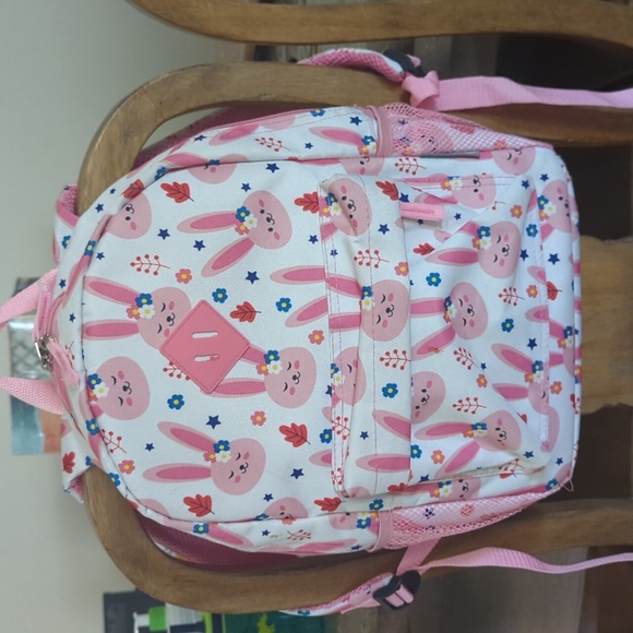Travelers club backpack. white with pink rabbits. very good used condition. Does have my daughter's name on the inside. please see photos. Lightweight with padded straps and a suitcase strap on the back for travel. Two water bottle mesh pockets( one on each side. Large zipper pocket and one small zipper pocket in the front.