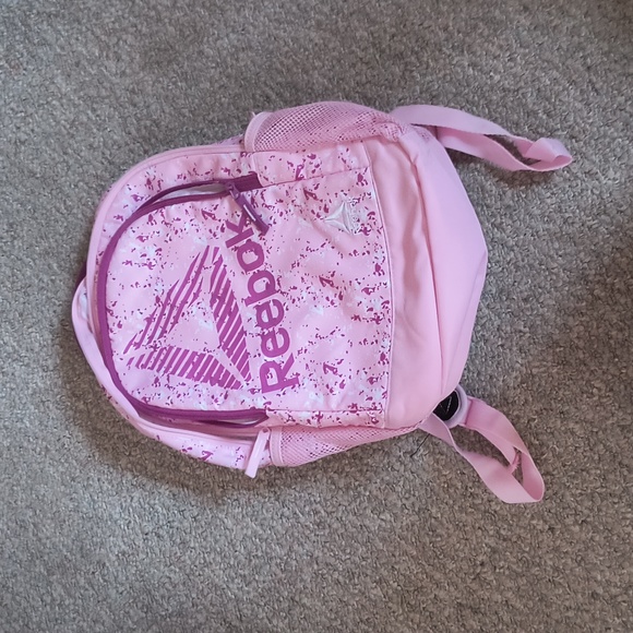 a pink Reebok backpack, it hasn't been used but does not have tags. All zippers work great, there are two main sections for books and things as well as a drink holder on either side.