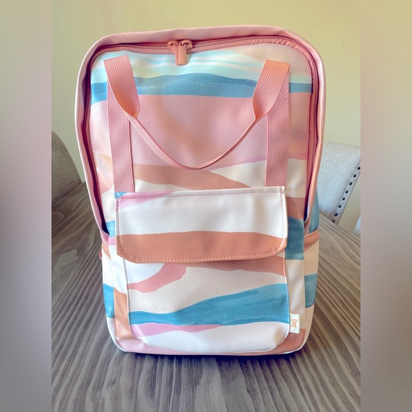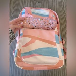 Cute tie dye backpack - colors include pink, blue, and peachy / orange. Pink straps are adjustable. Top tote handles. Inside print is multi colored terrazzo (pictured). Single small pocket on the outside front with snap closure. No pockets on the inside. Some small scuff marks on the front which is reflected in the price.
