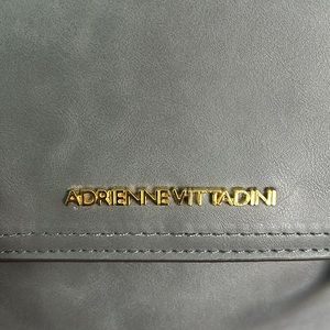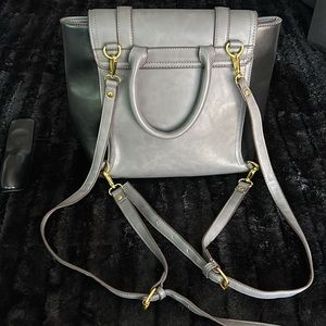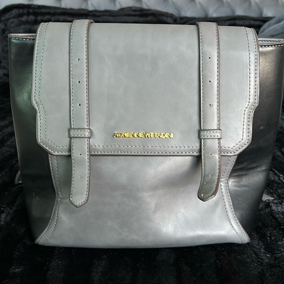 Adrienne Vittadini backpack, leather, grey and black, red lining. Beautiful.
