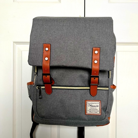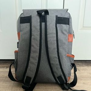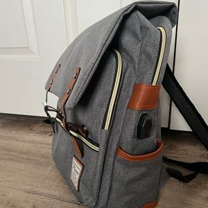 Two zipper compartments, adjustable magnetic close flap, side pockets, internal charging portal.