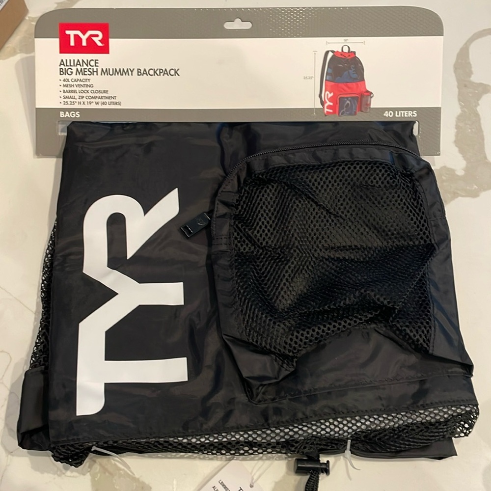 TYR Big Mesh Mummy Backpack . Brand new . Black . 40 liter capacity.. great for snorkel stuff , as a beach bag or just all around bag.. I use as travel laundry bag and carry laundry products in front pocket .. works great!
