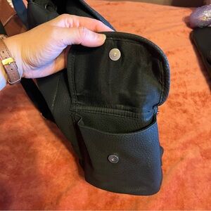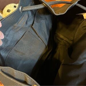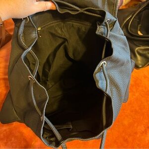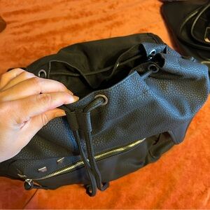 black faux pu leather texture silver studded, one large front pocket, smaller side pockets, drawstrings and adjustable straps