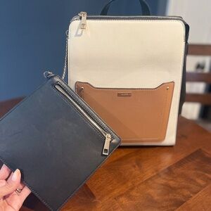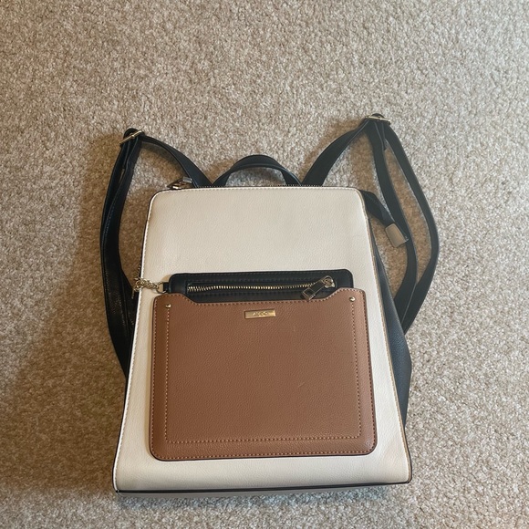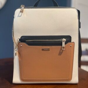 Aldo backpack bag. 11” wide 12” tall. Cream/tan/black. Two separate compartments and pockets. Not padded. Excellent condition. No wear. Nonsmoking home.
