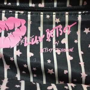 is a Betsey Johnson black and pink quilted backpack purse with three small pockets on the inside two small pockets on the outside front on the side and one large pocket in the back
