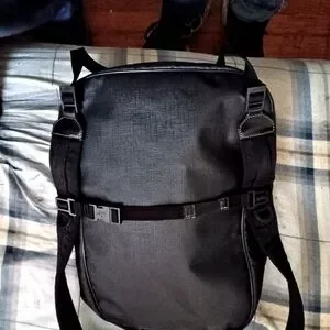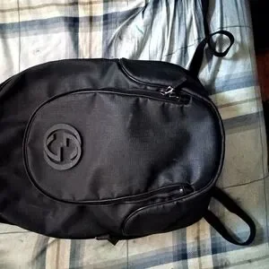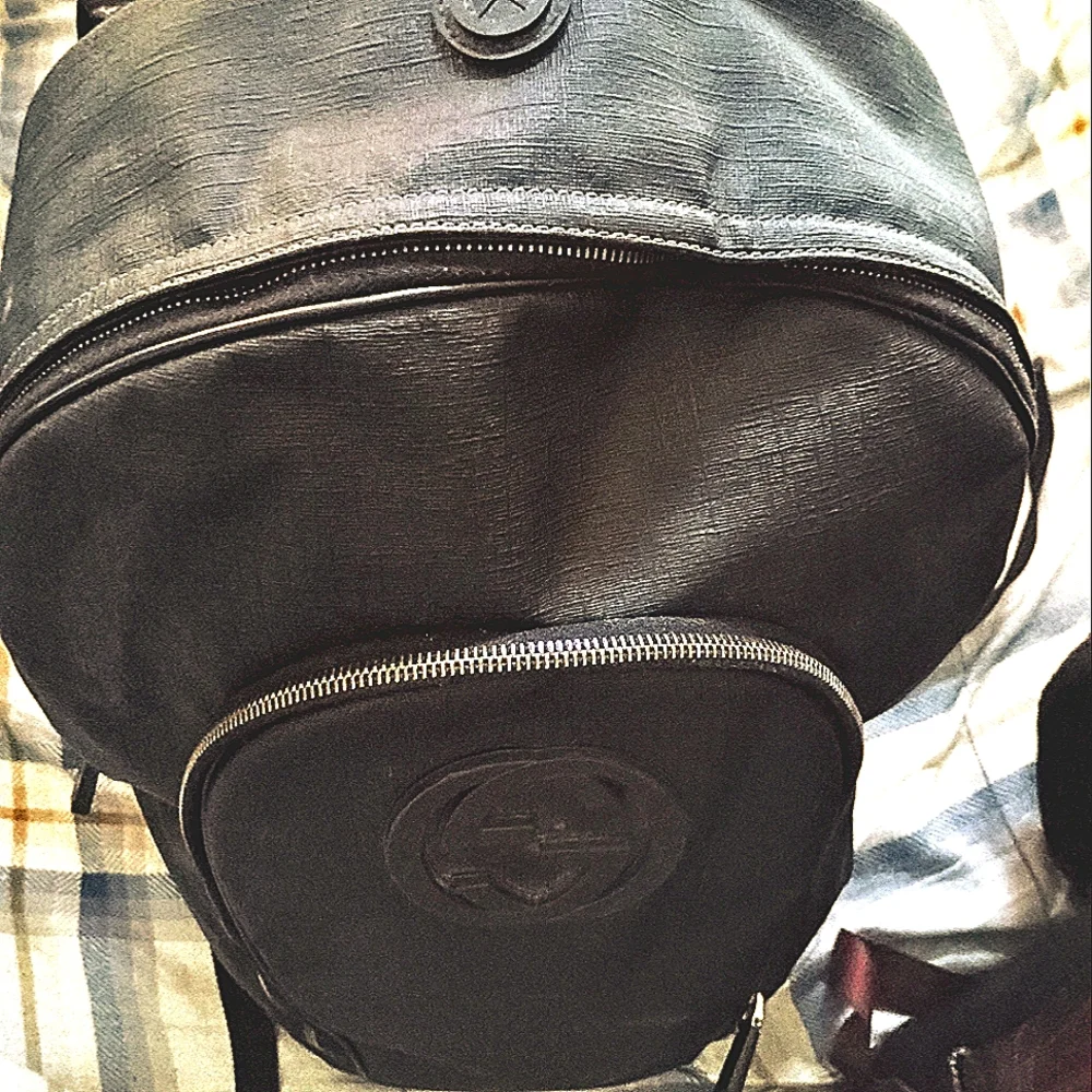 Gucci black, covered canvas, interlocking G backpack. Is missing one zipper pull and has small (scratch) blemish under logo, other wise is like new.