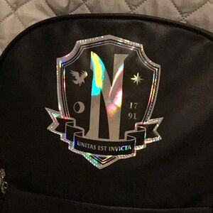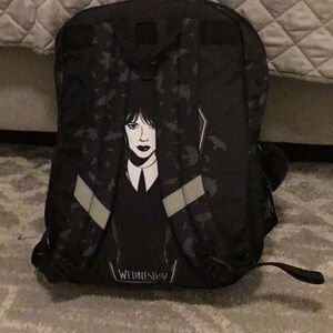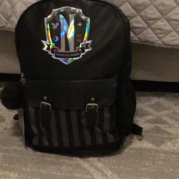 Wednesdays backpack has black Pom Pom on side. Back is super cute