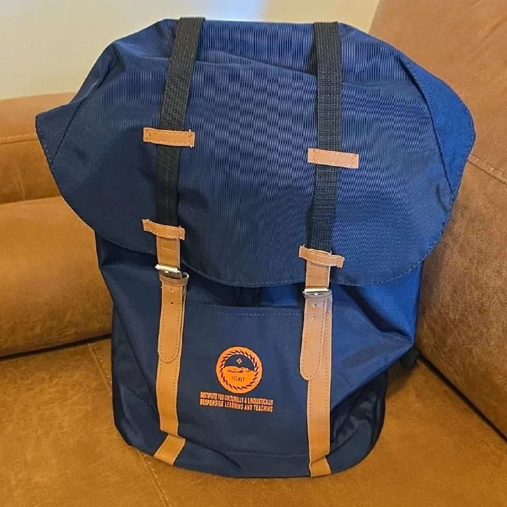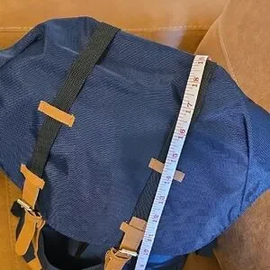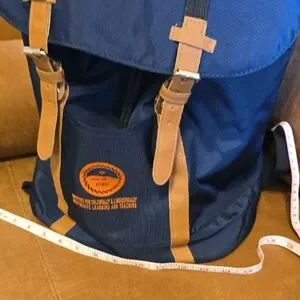 Explore with this stylish navy and tan backpack, featuring a distinctive logo. Designed for comfort and durability.