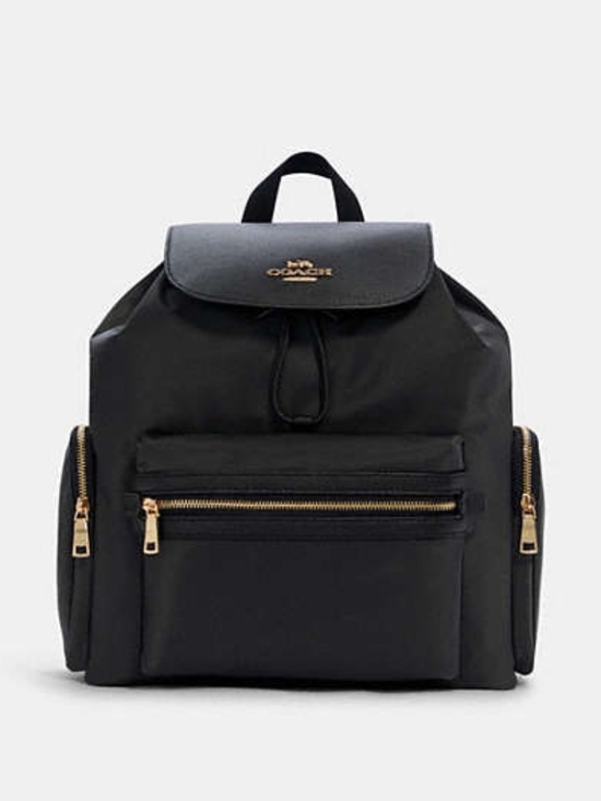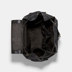 Nylon and refined leather Inside zip and multifunction pockets Snap and drawstring closures fabric lining Top handle with 1/2 drop Outside zip pockets Adjustable shoulder straps Two stroller attachment straps Changing pad included 12 1/2 (L) x 14 (H) x 6 (W) Style No. C6808