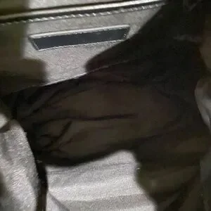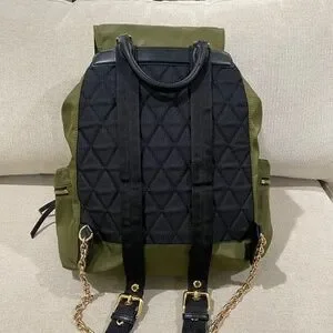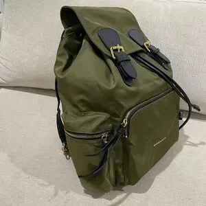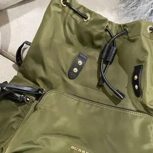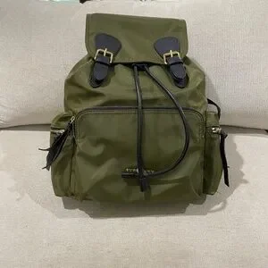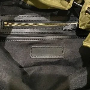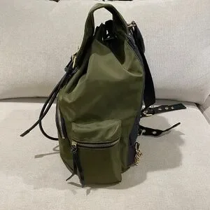 Olive Green Nylon with multiple pockets, leather trim, adjustable shoulder straps no brand. Smoke free home
