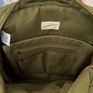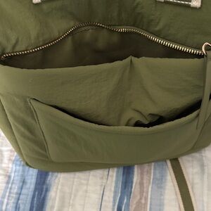 This olive green backpack is lightweight and has a water bottle pocket on each side, a small front pocket, a small zipper compartment, and a large zipper compartment. All zippers are in working condition.