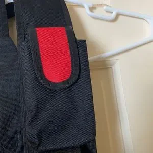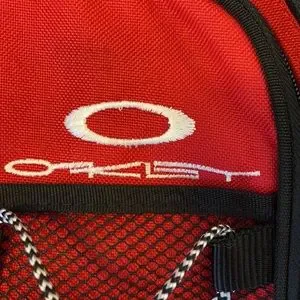 Red , black, white pack . Three zippered pockets. One velcro pocket on adjustable strap. Mesh pocket. Rope strap for water bottle. Body measures approximately 18 inches. A stylish piece!
