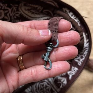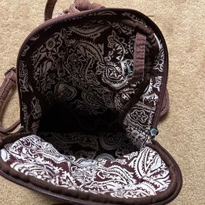 Small backpack with lots of pockets and a zipper pouch. Super cute! Zipper works on one side.
