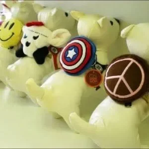 Multi-purpose accessory that fits onto a harness or worn as a wristlet, zippered pouch for poop bags or treats, squeaker inside.