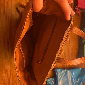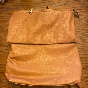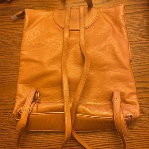 Gently used roomy backpack purse. Front pocket with button flap. Zipper close for main compartment. Gold hardware. Adjustable straps