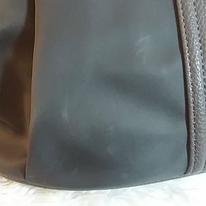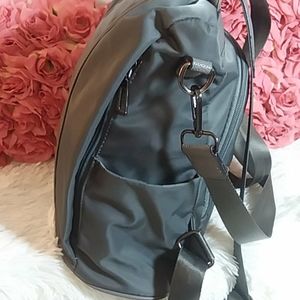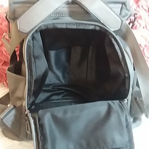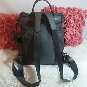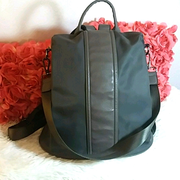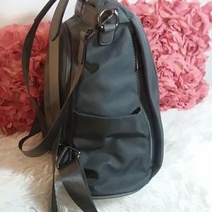 Sleek and modern gray backpack with shoulder strap. Unzips in the back. Two zipper pockets on front. Two open side pockets. Detachable shoulder strap is 27" long. Bag is 14"W×13"H×5.5"D. All gray. There are several white scuffs on the front as pictured, but they are hard to notice with the movement and sheen of the bag. Super cute😍😍😍