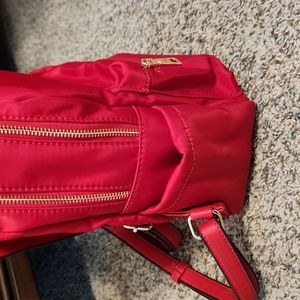 Red nylon backpack purse, beautiful gold hardware, plenty of storage pockets, thick sturdy straps and handle with gold feet on the bottom. EUC, only carried once!