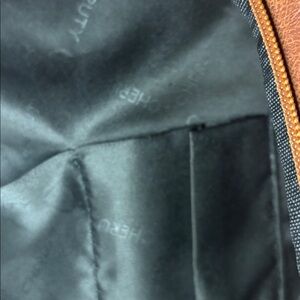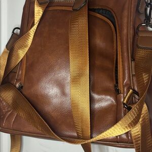 Has a few flaws but not noticeable, still has a lot of life in it. Faux brown leather.
