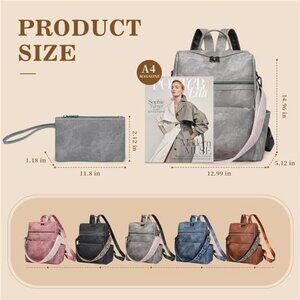 This leather backpack measures 12.99 x 14.96 x 5.12 inch (W*H*D), can hold A4 size magazines. Its weight is approximately 1.8 lbs. The size of the complimentary clutch bag is 11.8 x 5.12 x 1.18 inch (W*H*D). This women backpack purse has enough space to carry all your daily essentials, such as cosmetics, iPads, umbrellas, cups, books and other small items