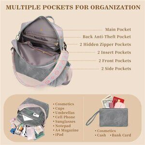 Vegan leather backpack purse have 8 storage pockets to keep your items organized. 1x Back Antitheft Zipper Pocket, 2x Exterior Front Pockets, 2x Side Pockets, 2x Interior Zipper Pockets in main compartment, 1x Large Main Compartment Zipper Pocket