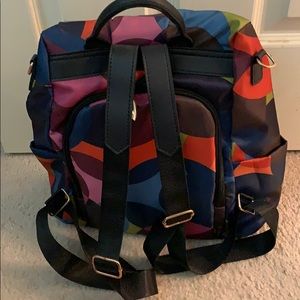 Brand New Never Used multicolored backpack bag with removable handbag strap. Lots of pockets and secure opening only in back.