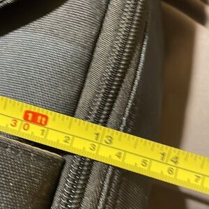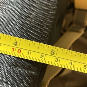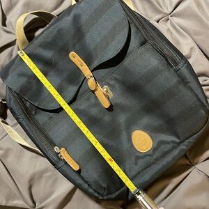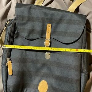 PacaPod backpack/diaper bag. Unisex. Clean and in good condition. Inner lining and out shell are 100% polyester. Black with tan leather trimming and gray cloth straps.