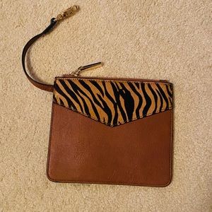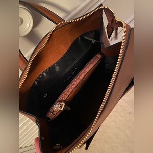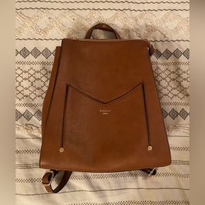 Cognac brown faux leather backpack with small matching pouch! Interior of the backpack is divided into two sections with a zippered compartment in between, as well as one small interior pocket. The small pouch clips into the interior and fits right into the front pocket. Backpack straps are adjustable!