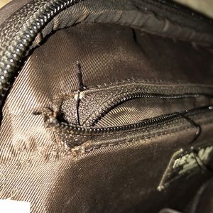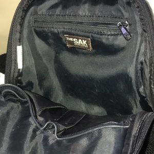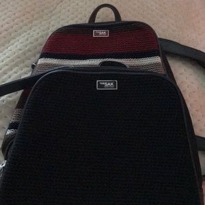 Well made ‘The Sak’ purses. One black, one brown with multicolored (maroon, balk, tan, cream) horizontal stripes. Small tear on inside pocket zipper of this one. Both in great used condition. Both bags are knitted material. $60 for both of them.