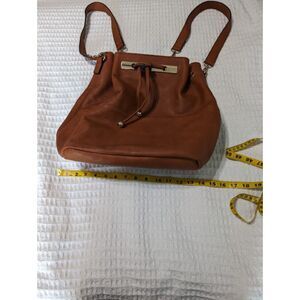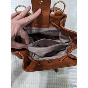 Backpack/Purse. Straps can be attached several different ways so it can be work as a backpack or as a shoulder bag. I believe this is faux leather. Bag has several inside compartments and one outside zipper compartment. This bag was never used. Pet free/smoke free home.