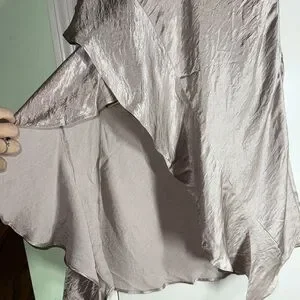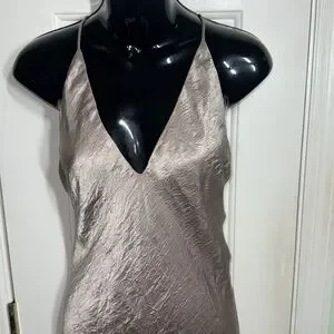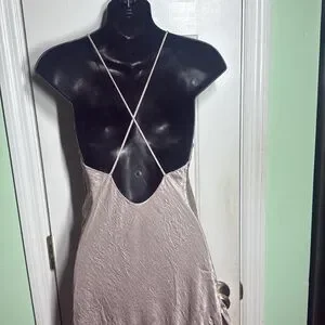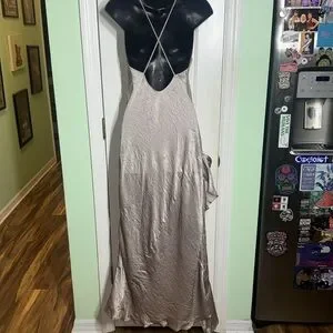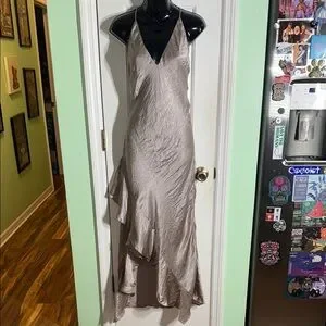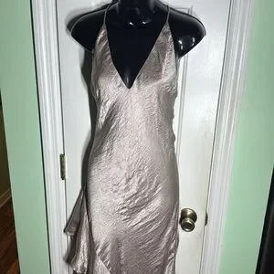 Shimmer in this gorgeous collaboration by Free People and Backstage. Asymmetrical pinkish silvery plunging backless evening gown. Perfect for special occasions, this dress offers a sophisticated look with its flowing design. EUC.