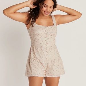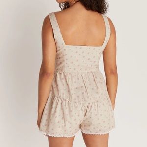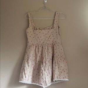 Backyard roses beige floral romper. Charming beige romper with a subtle pink floral print. Features a button-front bodice, wide straps, and a flared skirted short. Soft, breathable fabric for all-day comfort. Elegant, casual piece perfect for warm-weather styling. Super cute and in great condition!