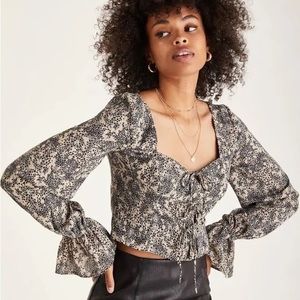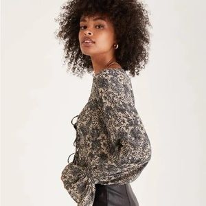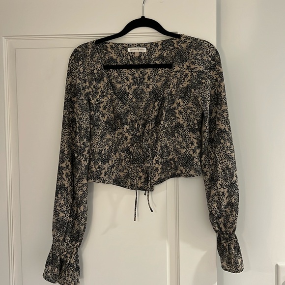 Never worn! Cropped tie top with ruffled sleeves. I’m typically a medium, 34 B and the top is slightly tight around my chest.