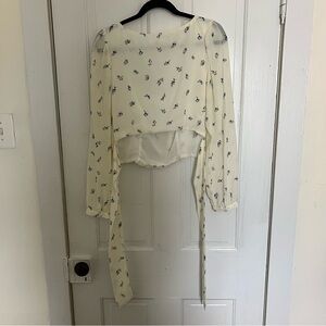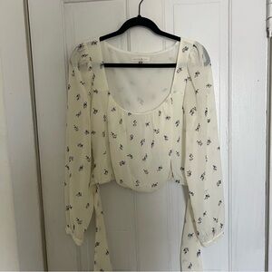 Scoop neckline with a tie back. Cropped. Worn once, just doesn’t fit me. Very romantic and cute top that would look great with a pair of light wash jeans.