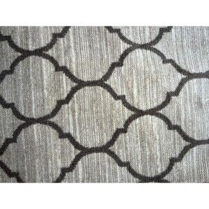 Color: Beige field with darker taupe/gray pattern and white fringe