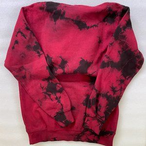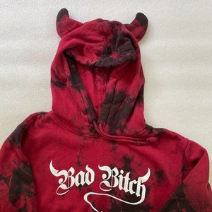Maroon and black reverse tie dye hoodie with 'Bad Bitch' front graphic. Front kangaroo pocket. Drawstring hoodie with devil ears.