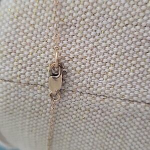 This delicate gold necklace features a fine chain and a small pendant that showcases a thin, curved design. Its minimalist style makes it an ideal accessory for everyday wear, adding a subtle touch of elegance to any outfit.